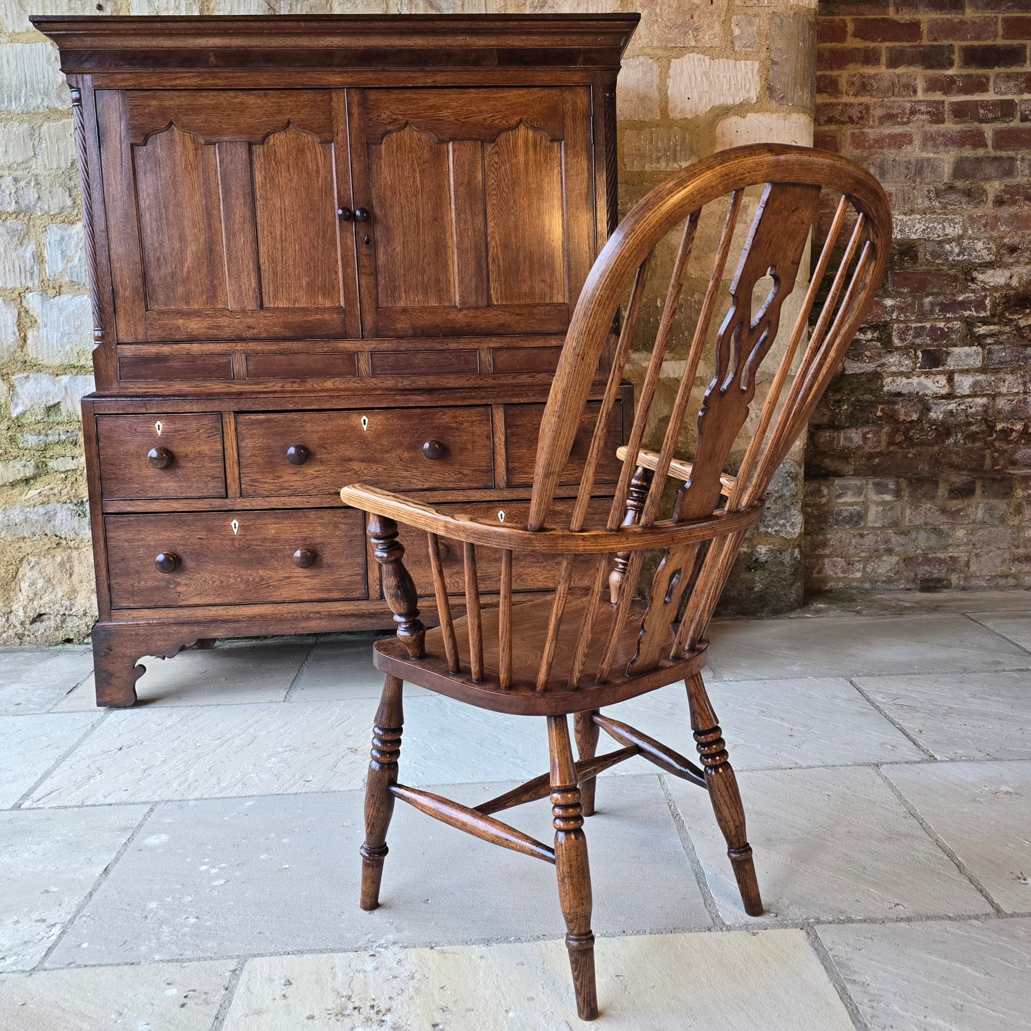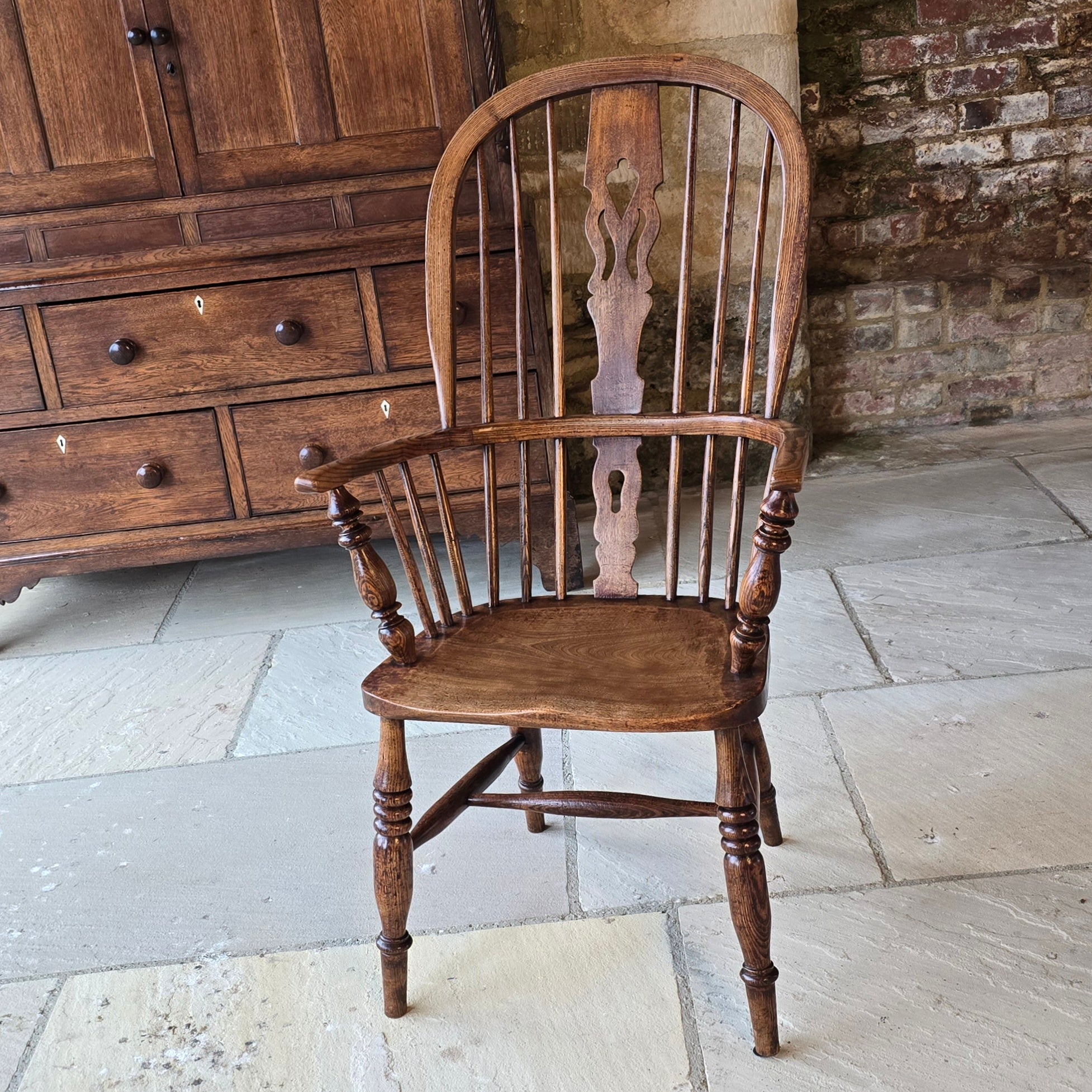 Well-proportioned-windsor-armchair-constructed-in-ash-elm-seat-fruitwood-splat-hoop-stick-back-central-shaped-splat-pierced-decoration-arm-bow-baluster-shape-supports-saddled-seat-turned-legs-H-shape-stretcher-very-comfortable-excellent-solid-condition-Lincolnshire-circa-1860-90-for-sale-damon-blandford-antiques-stow-on-the-wold-anttique-seating
