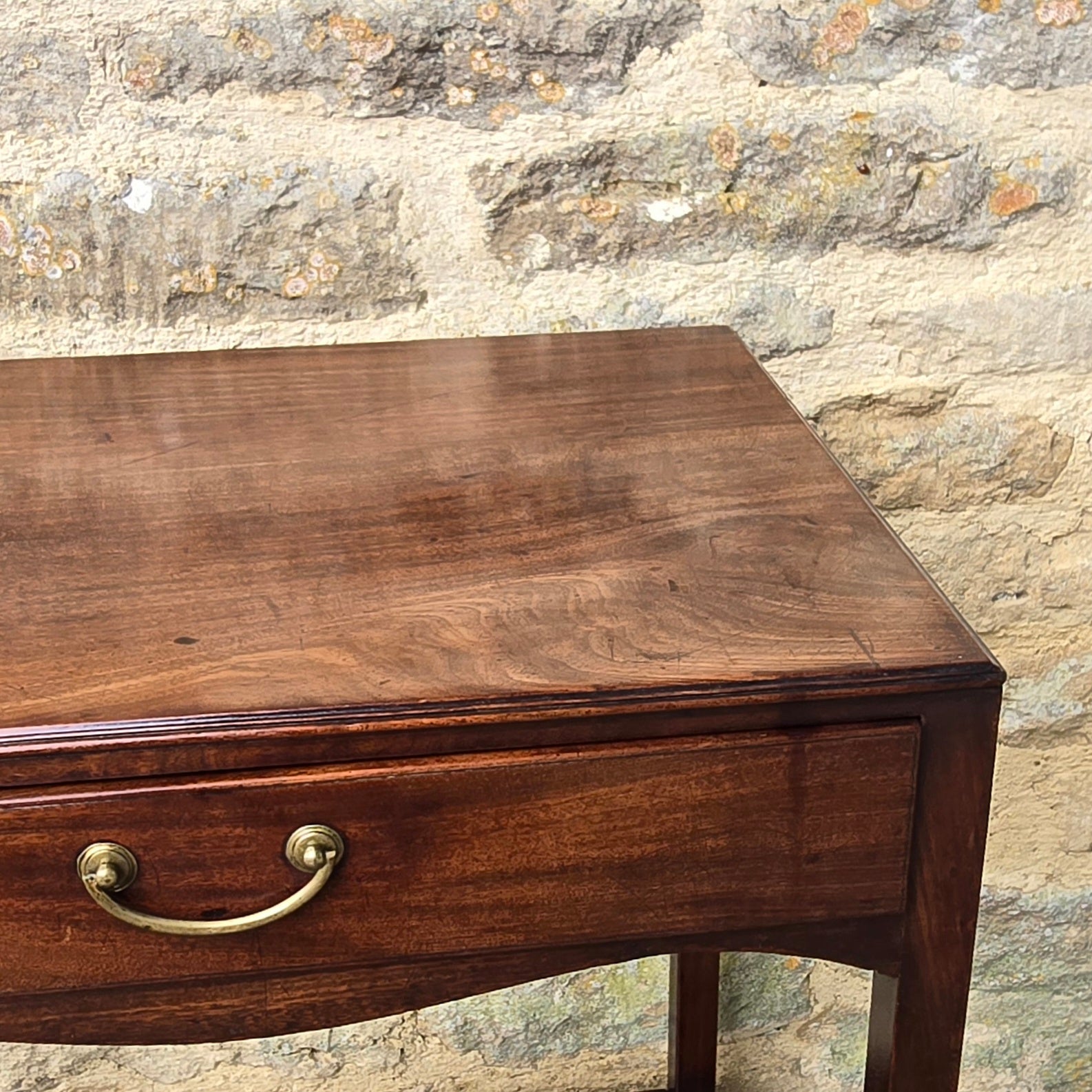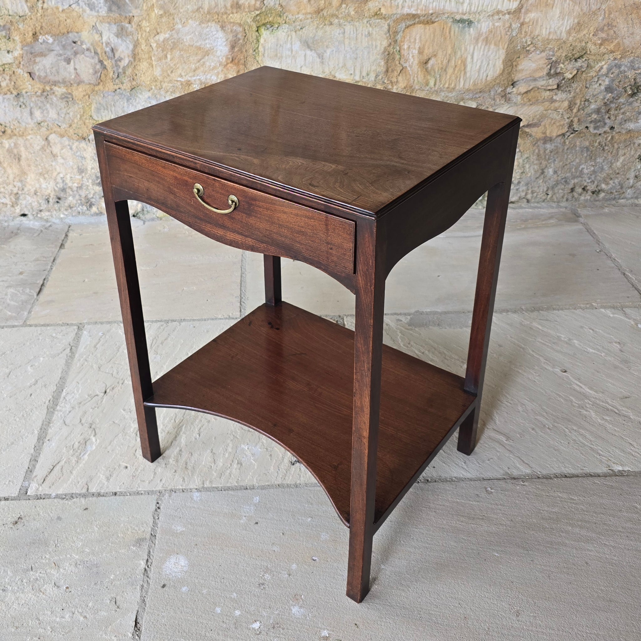 elegant-georgian-mahogany-side-centre-table-frieze-drawer-under-tier-highly-original-condition-fine-furniture-moulded-top-edge-oak-lined-drawers-dovetail-joints-original-brass-drop-handle-shaped-frieze-elegant-proportions-square-legs-concave-shaped-under-tier-sofa-side-table-lamp-table-english-circa-1740's-for-sale-damon-blandford-antiques-stow-on-the-wold